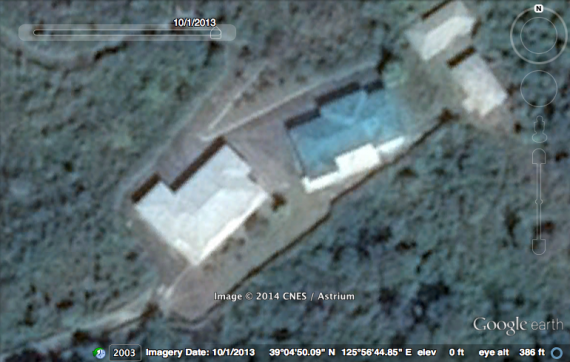 But analysis of satellite pictures of the facility, available through Google Earth, reveal the satellite dishes didn’t exist until at least late 2013 — the most recent date for which imagery is available. In the picture below, the Kyodo image was taken in front of the building on the right, looking towards the south west.