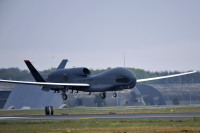 An RQ-4 Global Hawk from Andersen Air Force Base, Guam lands at Misawa Air Base, Japan, May 24, 2014. The aircraft is part of the 69th Reconnaissance Group Detachment 1 and is the first Global Hawk to land in Japanese territory. (U.S. Air Force photo/Staff Sgt. Nathan Lipscomb)