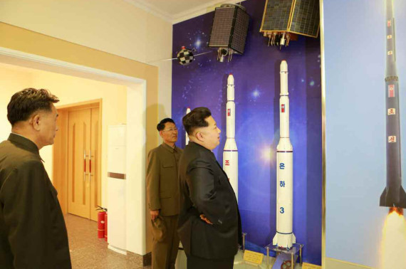 Kim Jong Un observes models of the Unha rocket series and the satellites they were launching into orbit in this image from the Rodong Sinmun on May 3, 2015.