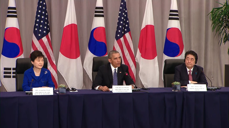 South Korean President Park Geun Hye said the three countries had “in-depth” discussions and agreed to cooperate closely on enforcing recent U.N. sanctions imposed on North Korea. Abe said the three countries would work towards “concrete security and defense cooperation between the foreign affairs and defense authorities” of their countries.